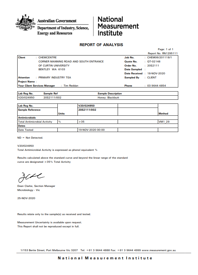 Rating: Independently tested for its antimicrobial activity levels at certified laboratories within Australia. This batch (V20/024950) has recorded a significant result >T/A 35+ which is the highest rating awarded by the National Measurement Institute, an Australian government body.