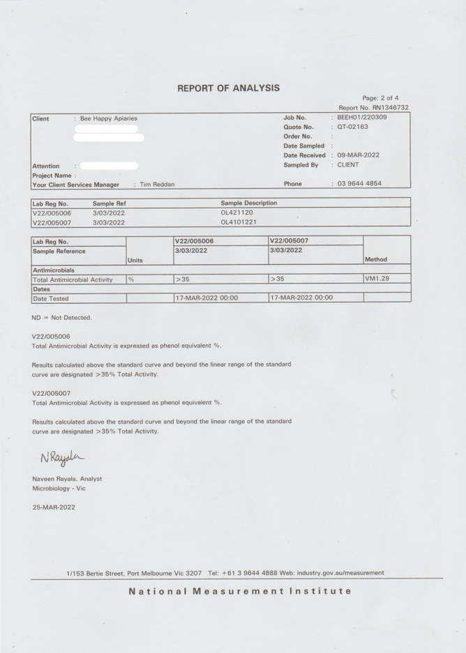 - Independently tested for its antimicrobial activity levels at certified laboratories within Australia. This batch (V22/005007) has recorded a significant result TA >35+ which is the highest rating awarded by the National Measurement Institute, an Australian government body