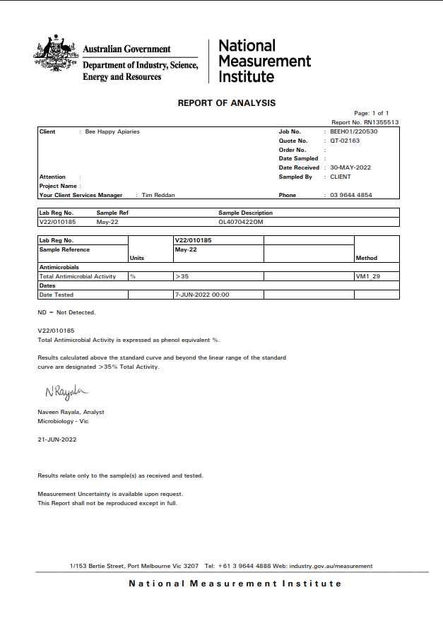- Independently tested for its antimicrobial activity levels at certified laboratories within Australia. This batch (V22/010185) has recorded a significant result >T/A 35+ which is the highest rating awarded by the National Measurement Institute, an Australian government body