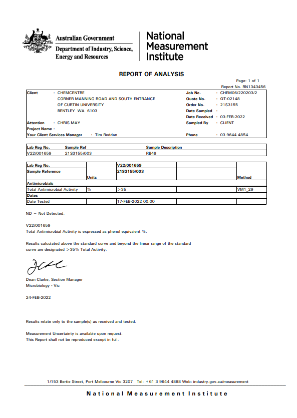 Rating: Independently tested for its antimicrobial activity levels at certified laboratories within Australia. This batch (V22/001659) has recorded a significant result >T/A 35+ which is the highest rating awarded by the National Measurement Institute, an Australian government body.